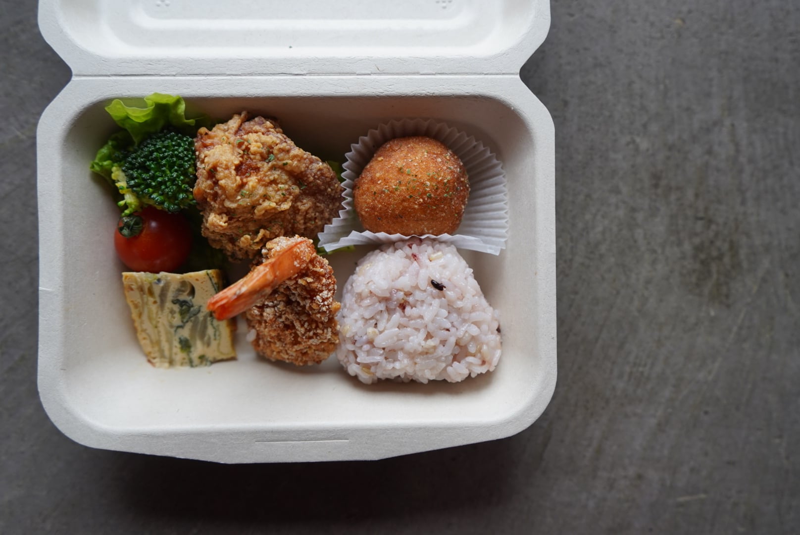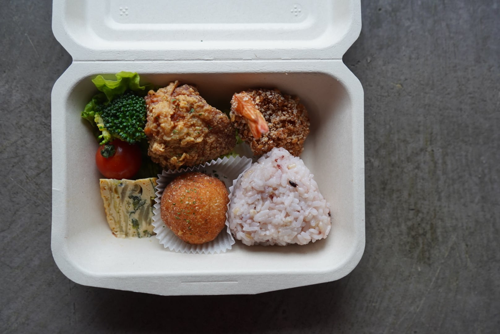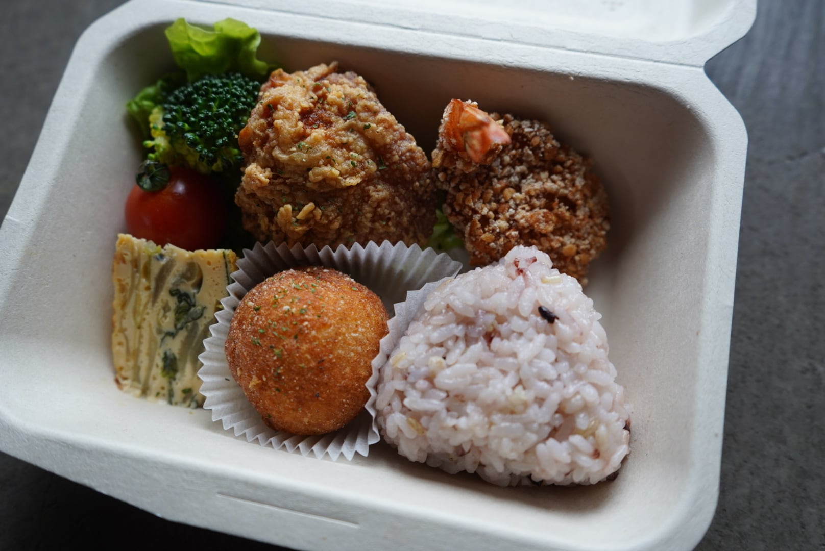 鶏のから揚げ・オムレツ・コロコロポテトなどおかず4品と雑穀米の塩むすびセット